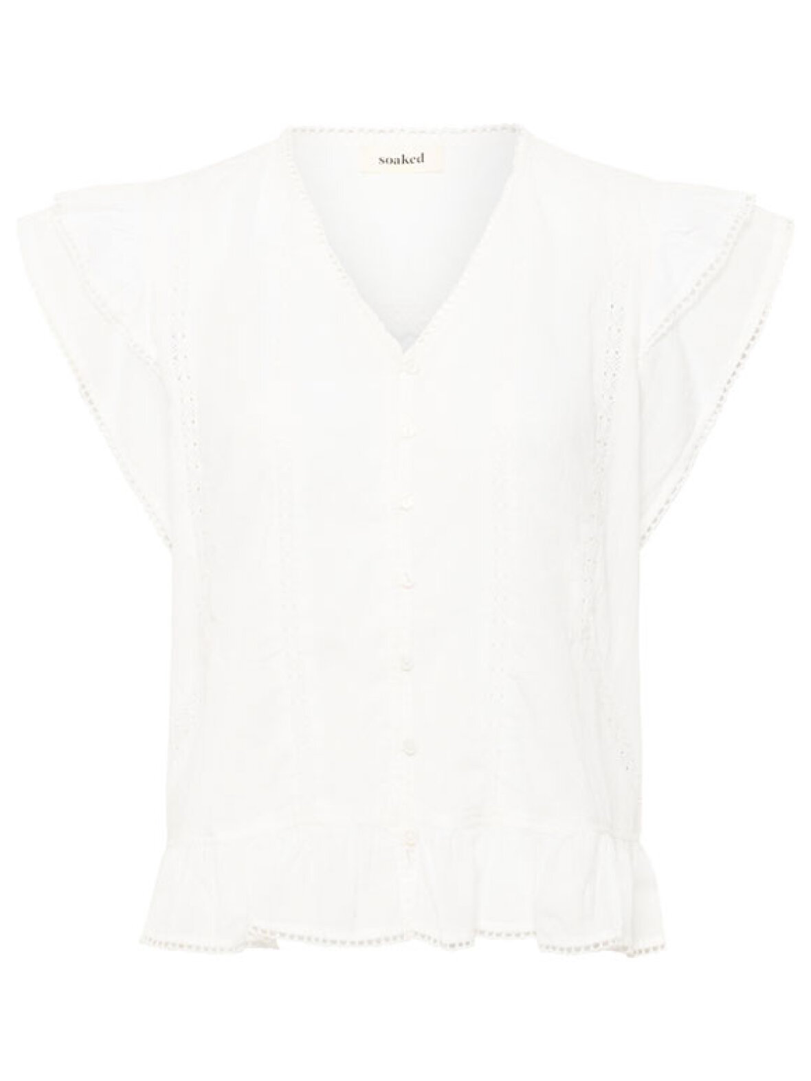Den elegante SLRuna top fra Soaked i klassisk hvid er et sikkert valg til en lys og stilren garderobe. De delikate blondedetaljer, flæseærmer og den lette kvalitet giver et romantisk og sommerligt udtryk, som passer perfekt til både hverdag og ferie.