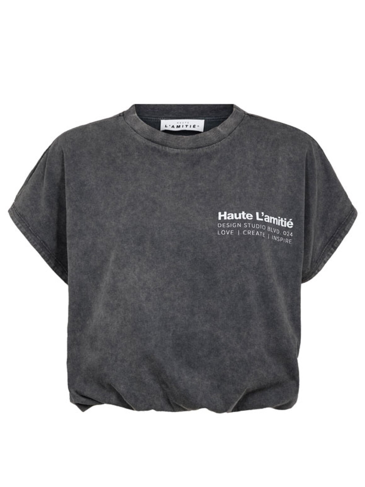 Denne Haute L’Amitié T-shirt i sort acid wash kombinerer et råt look med en feminin silhuet. Den unikke ballon-effekt med let rynk giver et trendy twist til den klassiske T-shirt, mens den vaskede finish skaber et eksklusivt, vintage-inspireret udtryk.
