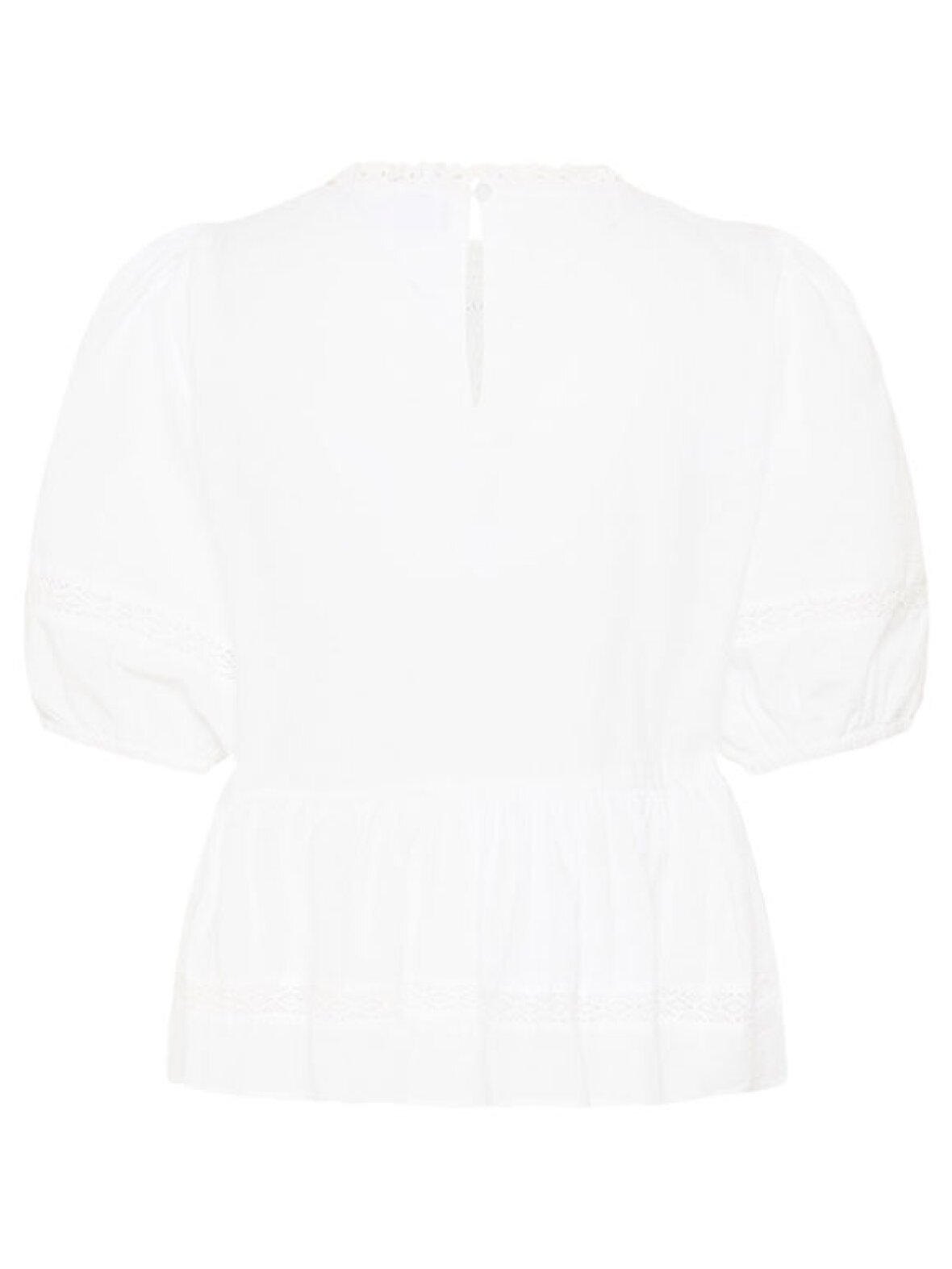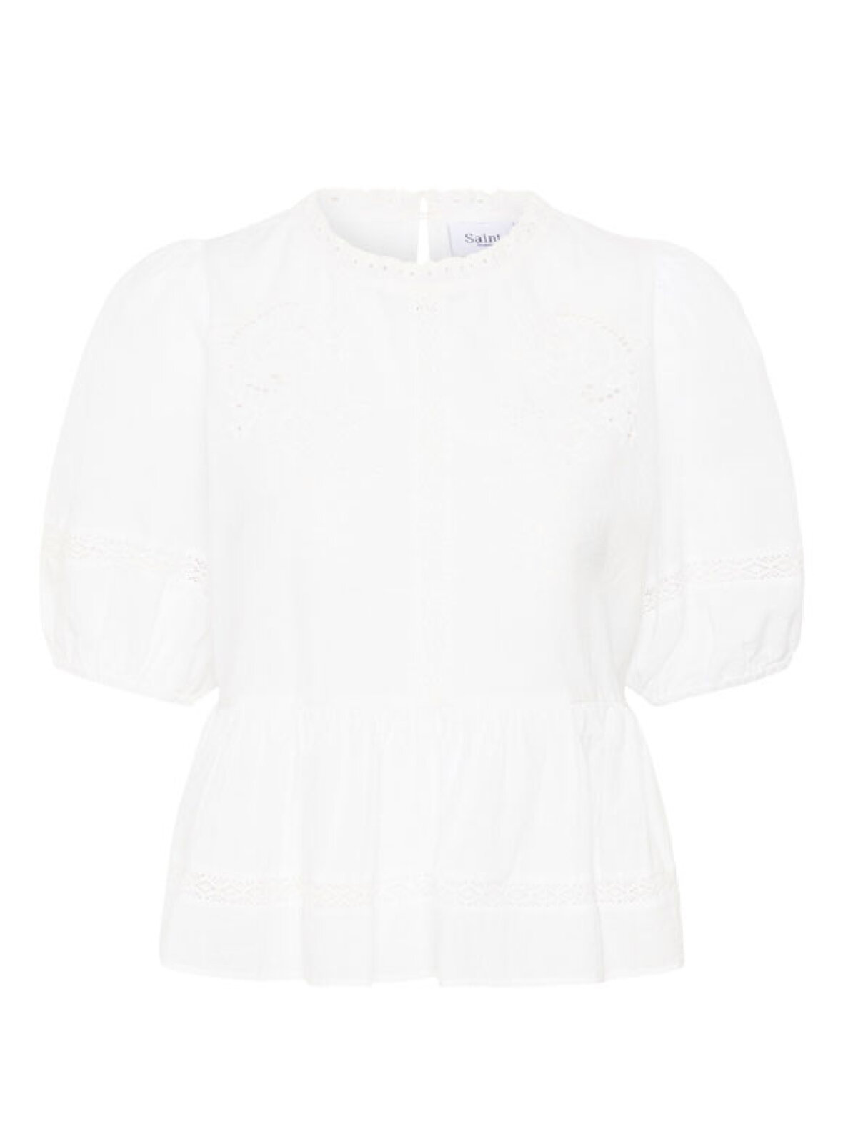 De fine broderi- og flæsedetaljer samt den lette peplum-effekt giver et feminint og elegant udtryk, mens de korte ærmer med volumen skaber en moderne silhuet.